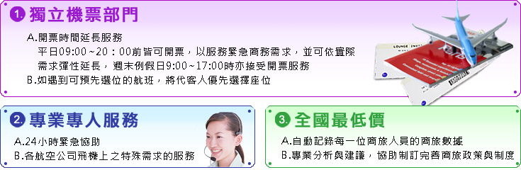 吉帝旅遊擁有獨立的票務部門,為您提供全方位服務!讓您每一次的飛行,都是全然的享受!除了一站購足的便利服務,專業的票務服務、完整的票務系統以及經驗豐富的專人為您打理每次商旅,悉心安排每個細節,讓您輕鬆完成重要任務!