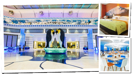 2015年盛大開幕的長隆企鵝酒店,坐落於珠海長隆國際海洋度假區內,特殊的建築構造與地理安排,為住客保留絕美的景觀河景。作為首座以全球最大企鵝極地主題酒店,坐落於珠海長隆國際海洋度假區內,特殊的建築構造與地理安排,為住客保留絕美的景觀河景。作為首座以企鵝為主題的酒店,迎賓大廳以湛藍為主色調,搭配挑高空間設計,結合海洋、沙灘素材,營造出明快生動的度假氣氛,完美呈現極地景觀,讓遠道而來的貴客們雖在珠海,卻彷彿來到南極般,與可愛的企鵝們近距離來場親蜜約會。總共2000間溫馨繽紛的客房,間間以不同的企鵝為設計靈感,透過各型各色的企鵝地毯、企鵝檯燈、企鵝牆面,濃濃的Q版極地風將大人小孩帶進童話般的風景中。來到酒店的餐廳,還有一隻隻憨厚逗趣的胖胖企鵝,隔著透明景觀窗陪您吃早餐呢!