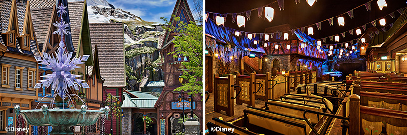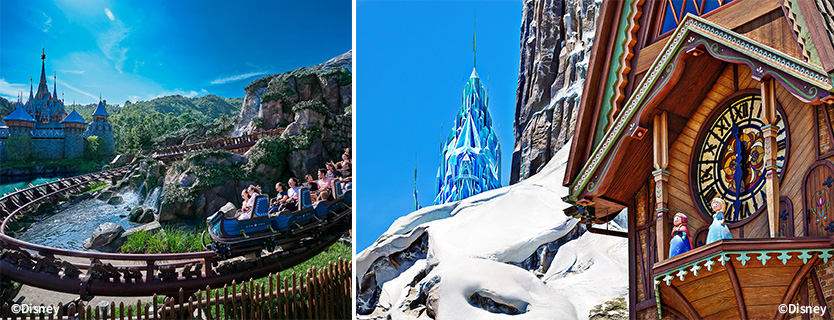 園區命名為「魔雪奇緣」,主題世界故事圍繞在夏雪節慶典。「魔雪奇緣」主題世界高度還原《冰雪奇緣》的各種場景,“For the First Time in Forever”讓遊客彷彿置身壯闊的《魔雪奇緣》電影世界,親身踏足阿德爾王國這個充滿生機的國度,慶祝紀念安娜以真愛拯救愛莎的 「夏雪節」。徙步環繞冰川峽灣而建的阿德爾小鎮,到訪以傳統風格建築的小屋、商店與攤擋,你將遇上熱情相迎的阿德爾王國國民,向你分享地道的美食、手信、服飾與音樂等風土人情與文化,更隨時於街上見到與村民打成一片的愛莎、安娜與基斯托夫。如你聽到耳熟能詳的電影旋律鐘聲,循音樂聲望向安娜與漢斯王子於電影裡共舞的鐘樓,宏偉的阿德爾城堡就近在眼前,城塔頂尖正散發著愛莎閃閃發光的冰雪魔法,抬頭更可見冰封的北山,愛莎冰雪皇宮的大門正為你打開,待你於碼頭登上小木船出發,探索「魔雪奇幻之旅」。一個個熟悉的電影場景,現在都成為你眼前的風景。