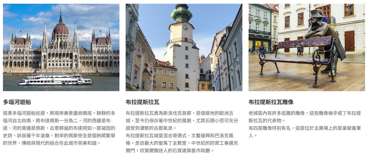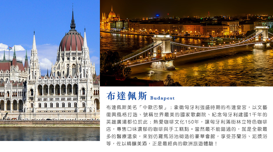 【布達佩斯】 布達佩斯是匈牙利的首府,也全國的行政與經濟文化中心。橫跨在多瑙河的兩岸,基本上由布達與佩斯兩個城市組合而成,左岸是古老又傳統的布達城,右岸則是充滿巴洛克與古典主義建築的商業城市佩斯。著名的景點有國會大廈、漁夫堡、馬提亞斯教堂、英雄廣場…等。
