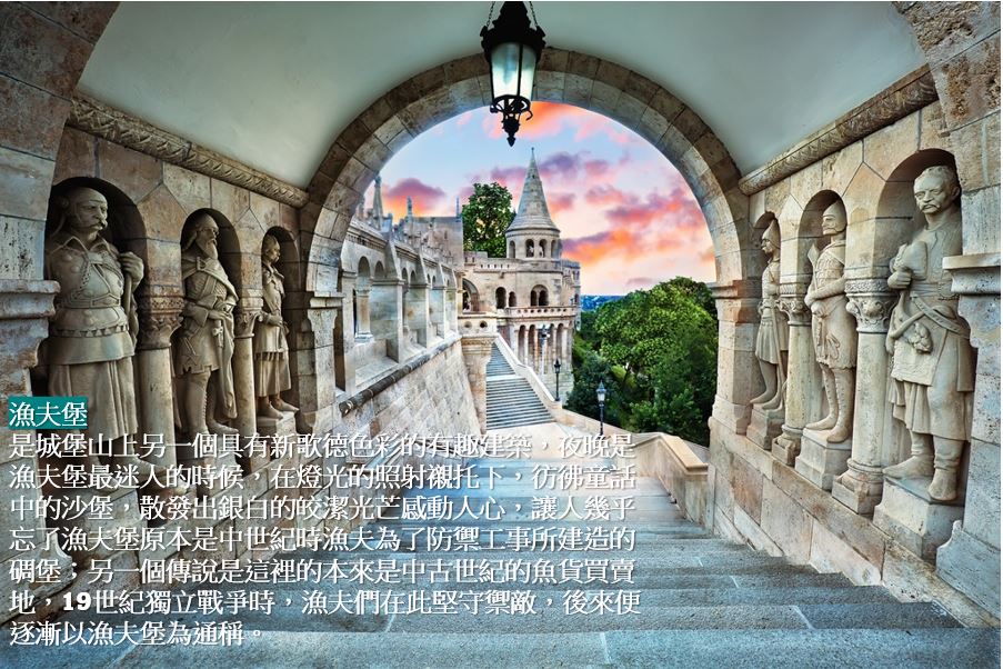 【漁夫堡】 是城堡山上另一個具有新歌德色彩的有趣建築,夜晚是漁夫堡最迷人的時候,在燈光的照射襯托下,彷彿童話中的沙堡,散發出銀白的皎潔光芒感動人心,讓人幾乎忘了漁夫堡原本是中世紀時漁夫為了防禦工事所建造的碉堡;另一個傳說是這裡的本來是中古世紀的魚貨買賣地,19世紀獨立戰爭時,漁夫們在此堅守禦敵,後來便逐漸以漁夫堡為通稱。