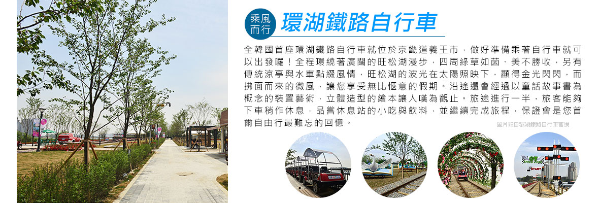 位於首爾市郊南部,京畿道的義王鐵道自行車由2016年4月開始運行,是韓國首個環湖的鐵道自行車。 鐵道全長 4.3 公里,自行車頂設有遮陽板,而鐵道地勢平穩,沒有太多上、下坡的區域,是適合一家大小一邊踏鐵道自行車,一邊欣賞旺松湖的自然景色的旅遊活動。