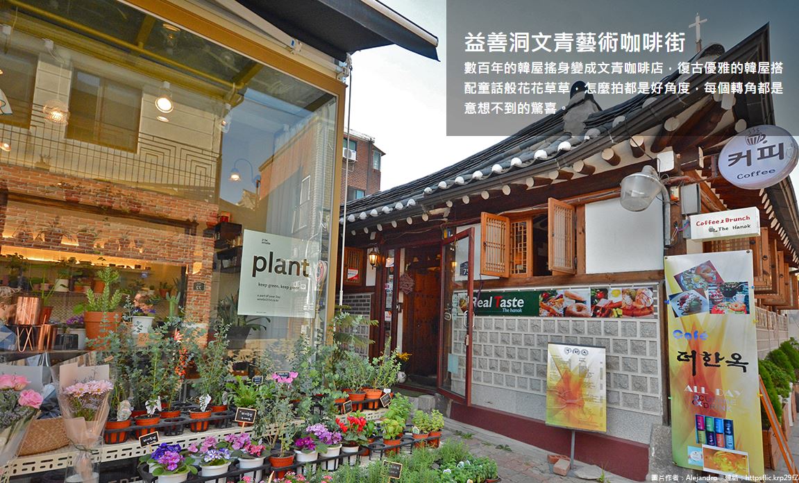 益善洞韓屋村於1920年形成,與北村的大型韓屋相比,益善洞主要是小坪數韓屋,小巷蜿蜒曲折,街道空間不大,傳統建築配上現代化的裝飾,進駐了許多特色咖啡廳、餐廳、文創小店等等,帶出文青清新的氣息,另外,這裡曾是韓劇「德魯納酒店」與「孤單又燦爛的神-鬼怪」的拍攝場景,更難怪成為韓國年輕人的熱門打卡地點。